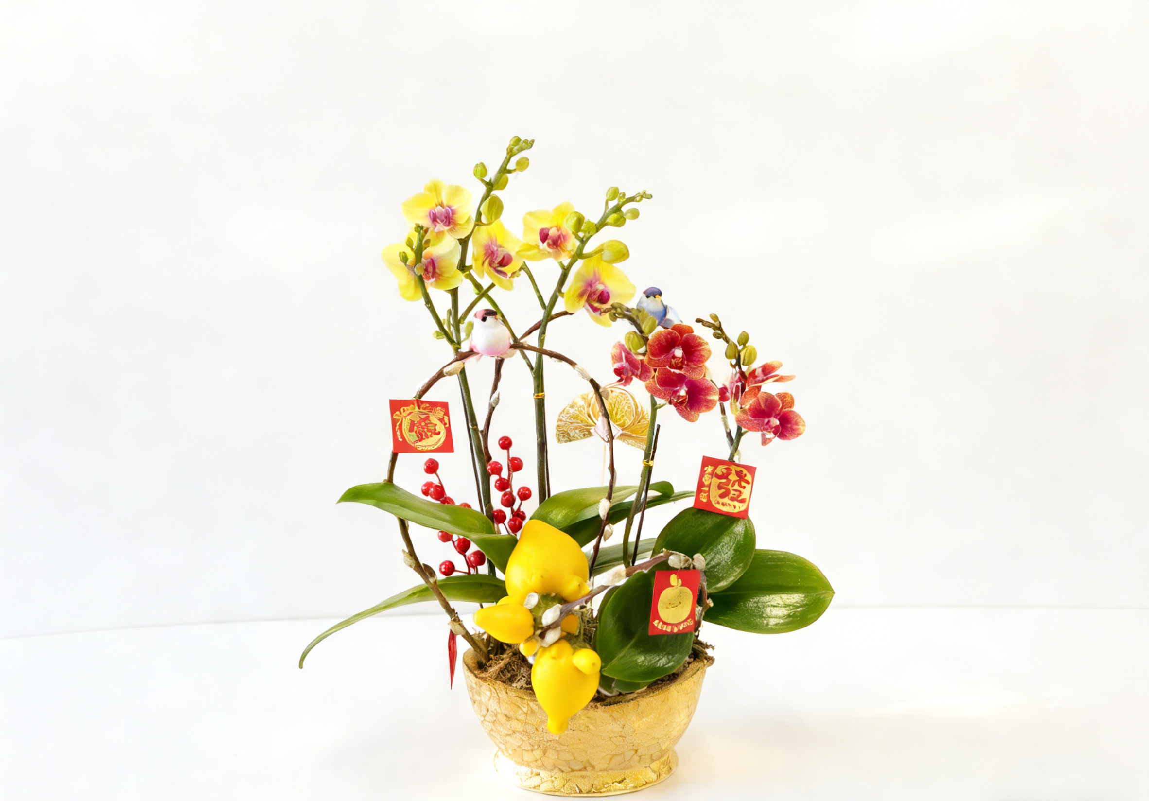 黃色及紅色蝴蝶蘭為主、配楊柳、小鳥擺件、金色元素、黃色金桔與多款紅色「發」字吊飾的金色裂紋盆年節開運花藝