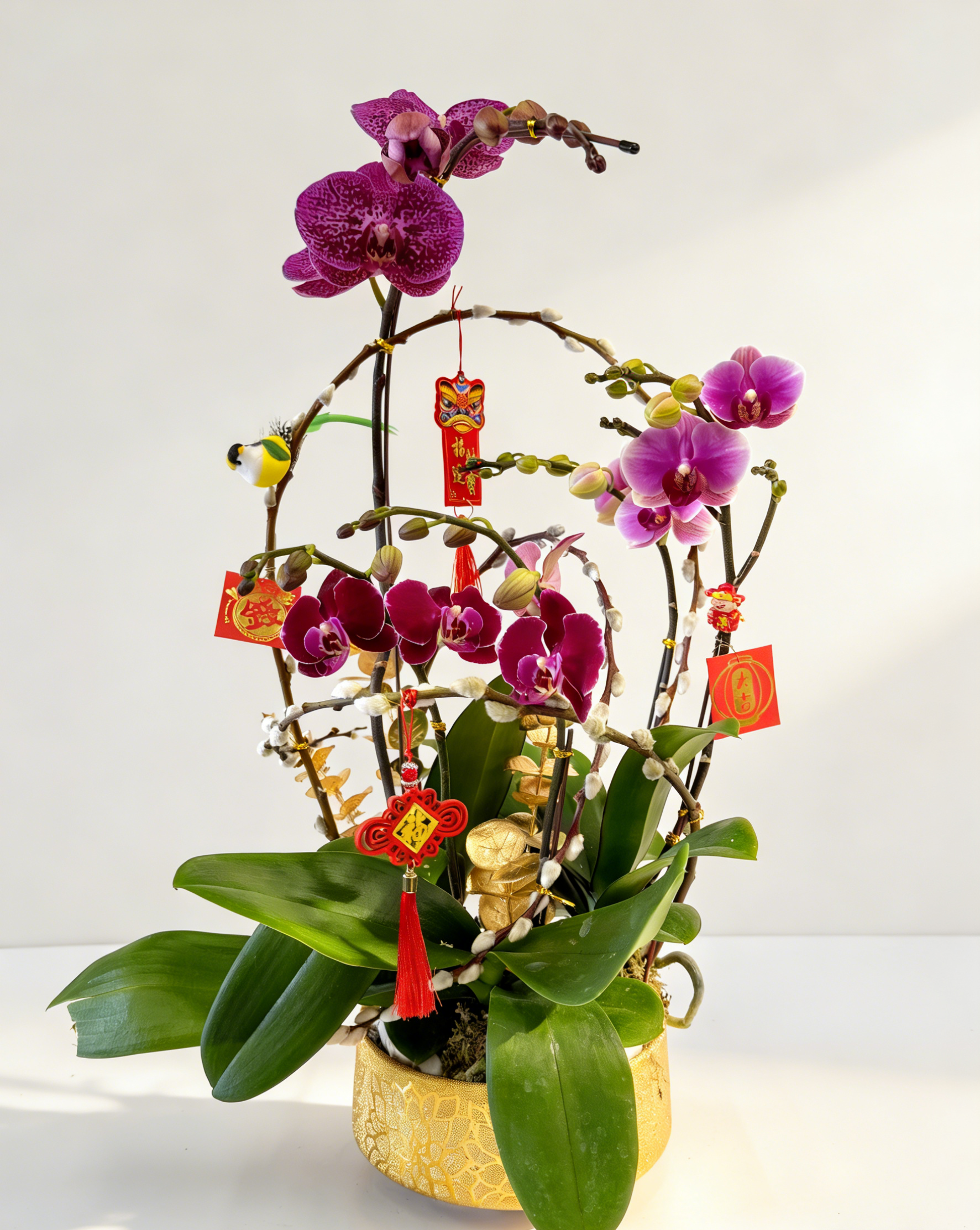 深紫色蝴蝶蘭為主、配楊柳、小鳥擺件、金色元素、多款紅色吊飾與金色裂紋盆年節開運花藝