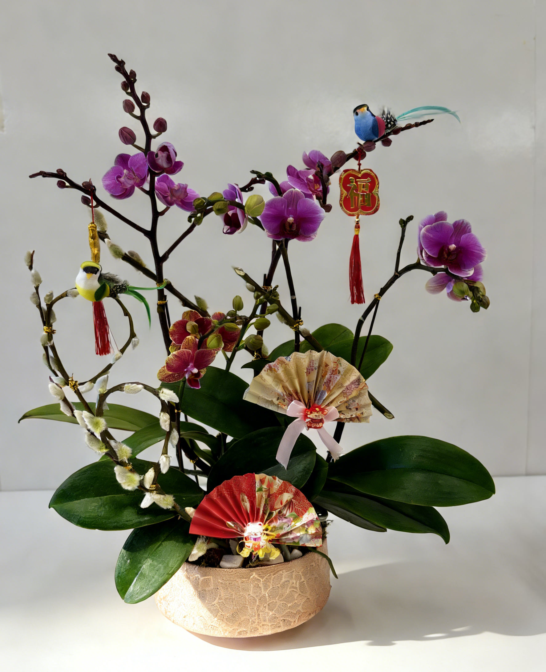 紫色及粉紅色蝴蝶蘭為主、配小鳥擺件、金色元素、紅色扇子與多款紅色「福」吊飾的粉金裂紋盆年節開運花藝