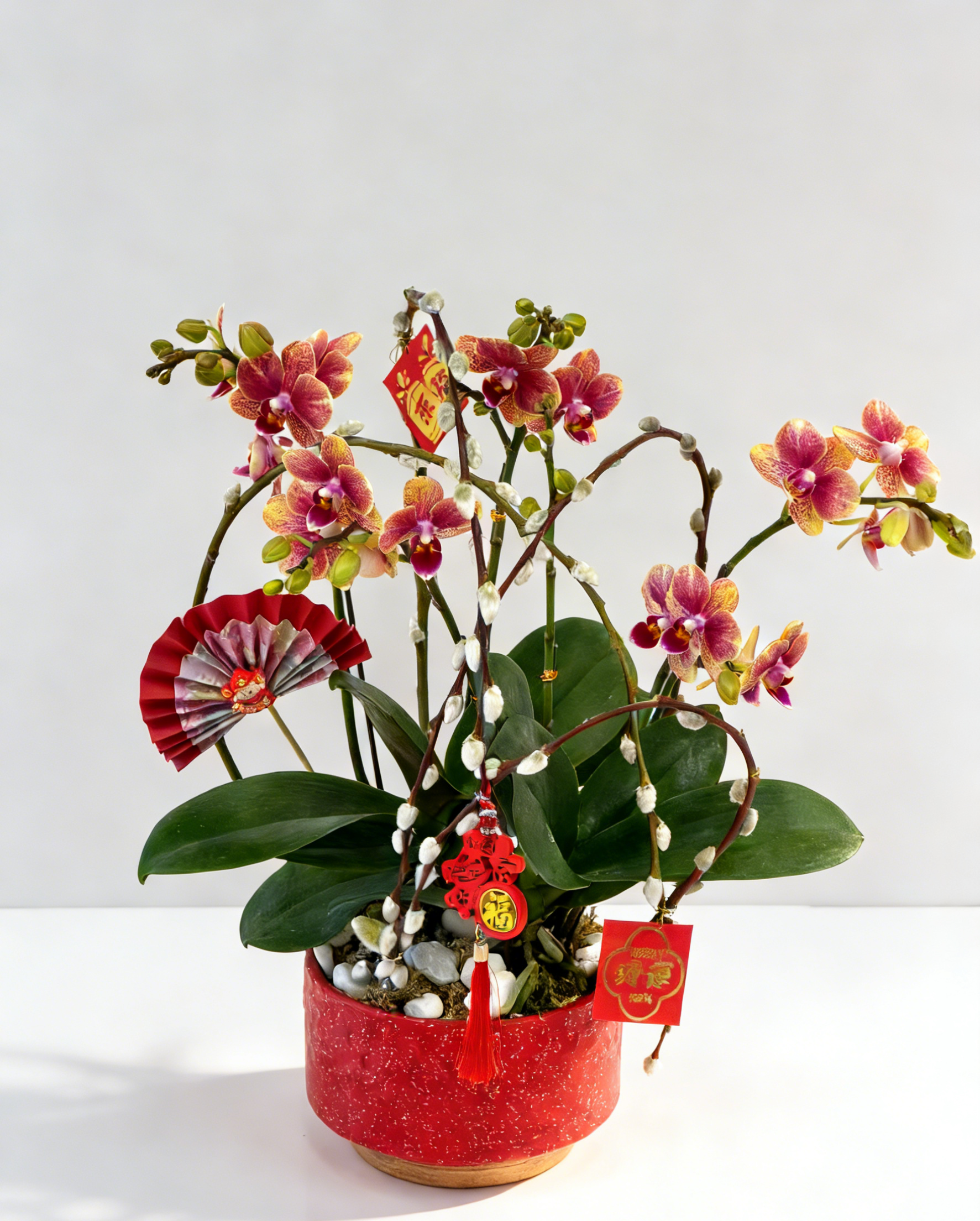 粉紅帶橙黃斑點蝴蝶蘭為主、紅色扇子與多款紅色「福」吊飾的紅色斑點盆年節開運花藝。