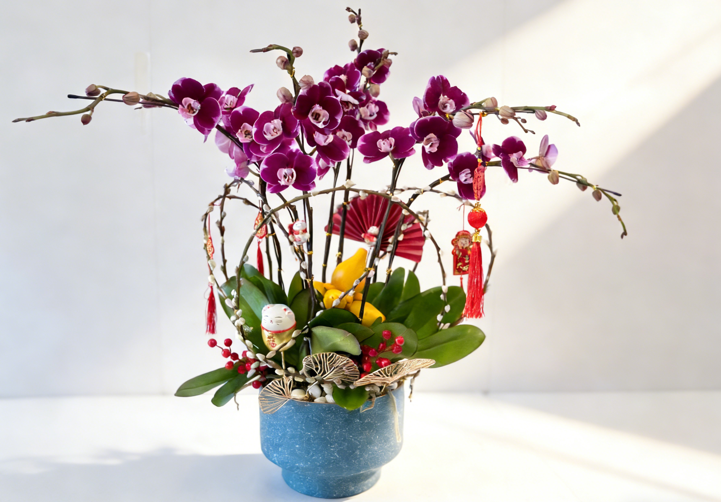 深紫色蝴蝶蘭為主、招財貓、紅色扇子與多款紅色吊飾的藍白斑點盆年節開運花藝。