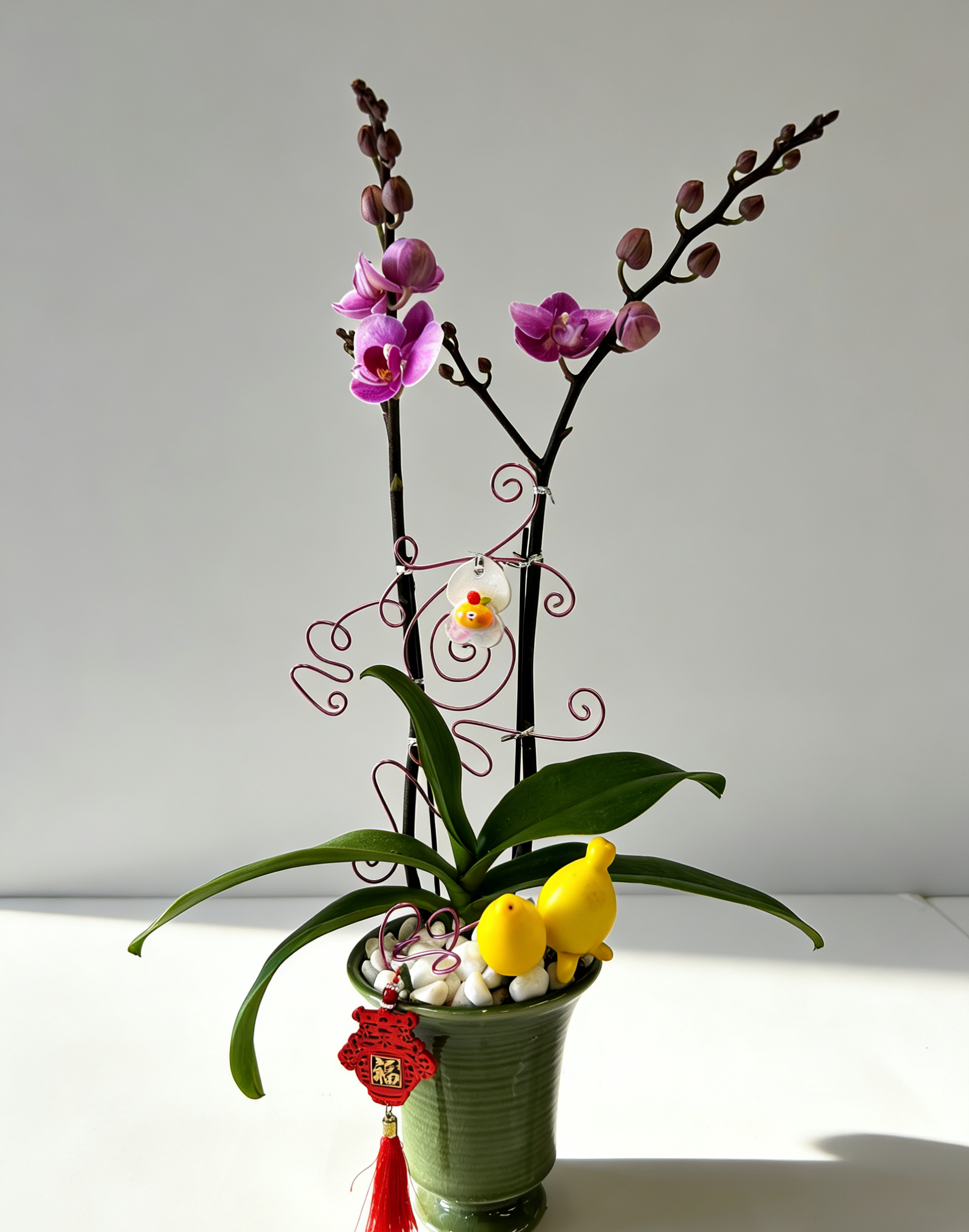 紫色及粉紅蝴蝶蘭為主、配粉色鐵絲裝飾、小鳥擺件與紅色「福」吊飾的綠色直紋盆年節開運花藝