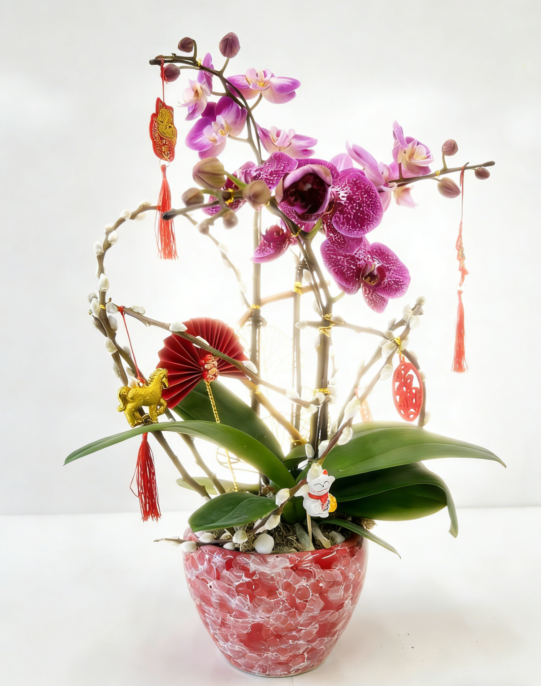 紫色及粉紅蝴蝶蘭為主、配招財貓、小馬吊飾、紅色扇子與紅色「福」吊飾的紅色裂紋盆年節開運花藝
