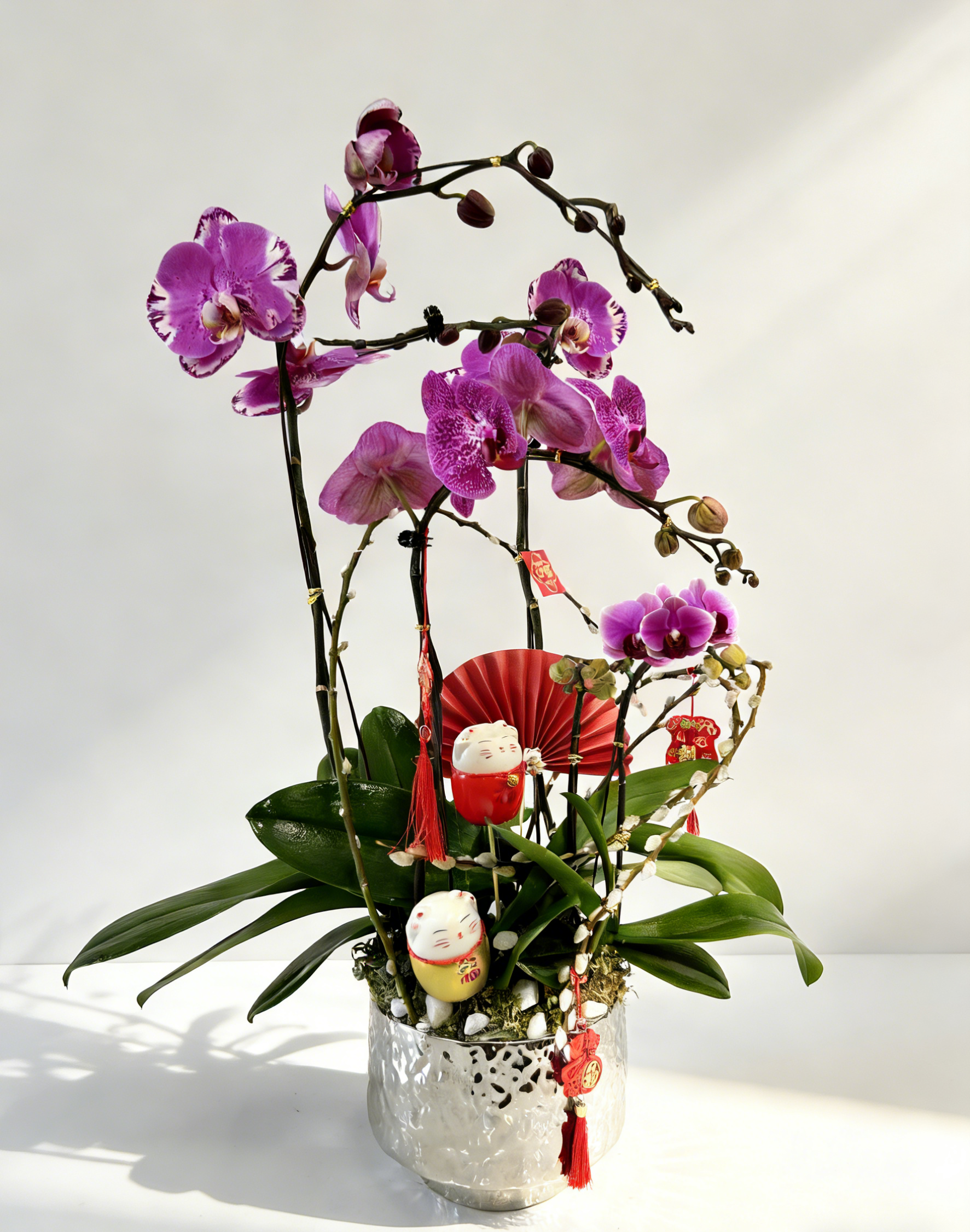 紫色蝴蝶蘭為主、配招財貓、紅色扇子與多款紅色「福」吊飾的銀色花紋盆年節開運花藝