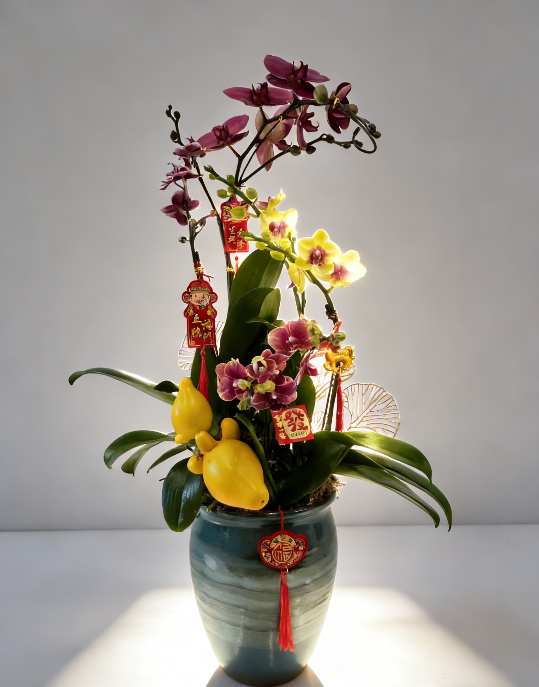紫色蝴蝶蘭為主、配招財貓、多款紅色「五福臨門」「發」吊飾的青直紋盆年節開運花藝