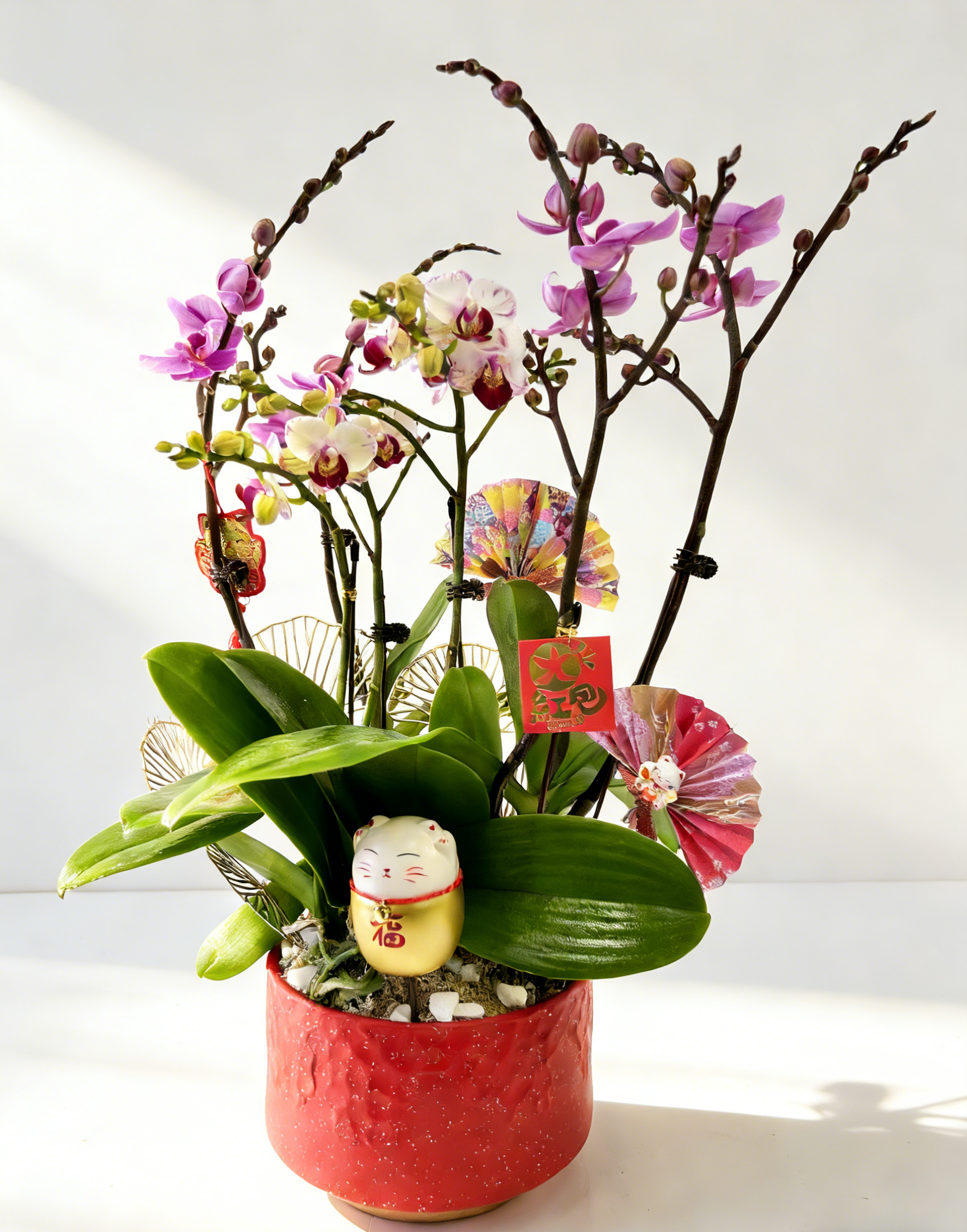 粉紫色及粉白蝴蝶蘭為主、配金色鐵絲裝飾、吊飾的紅色直紋盆年節開運花藝