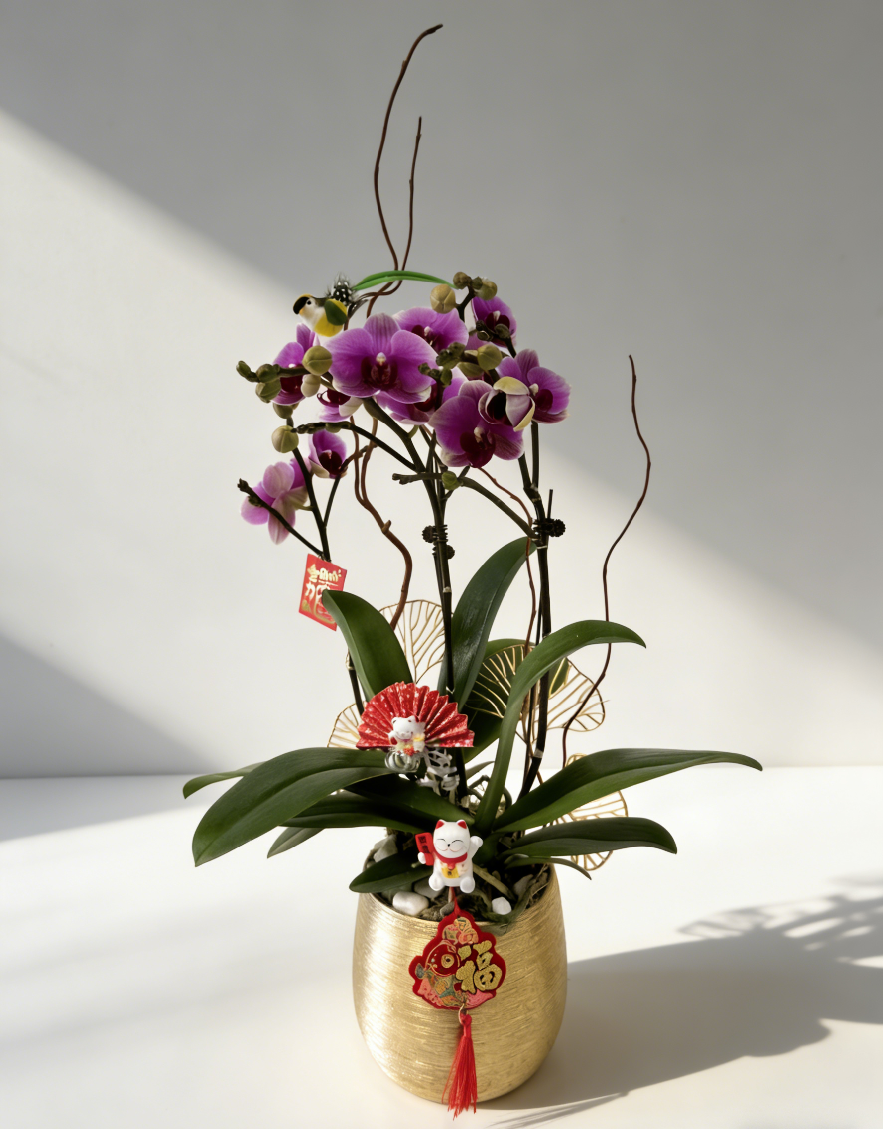 紫色蝴蝶蘭為主、配綠葉、招財貓、紅色扇子與多款紅色「福」「大吉」吊飾的金色橫紋盆年節開運花藝。