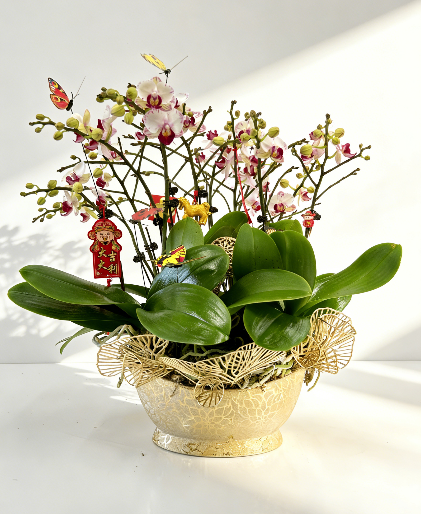 粉紅蝴蝶蘭為主、配綠葉、多款紅色「大吉大利」吊飾的金色裂紋盆年節開運花藝