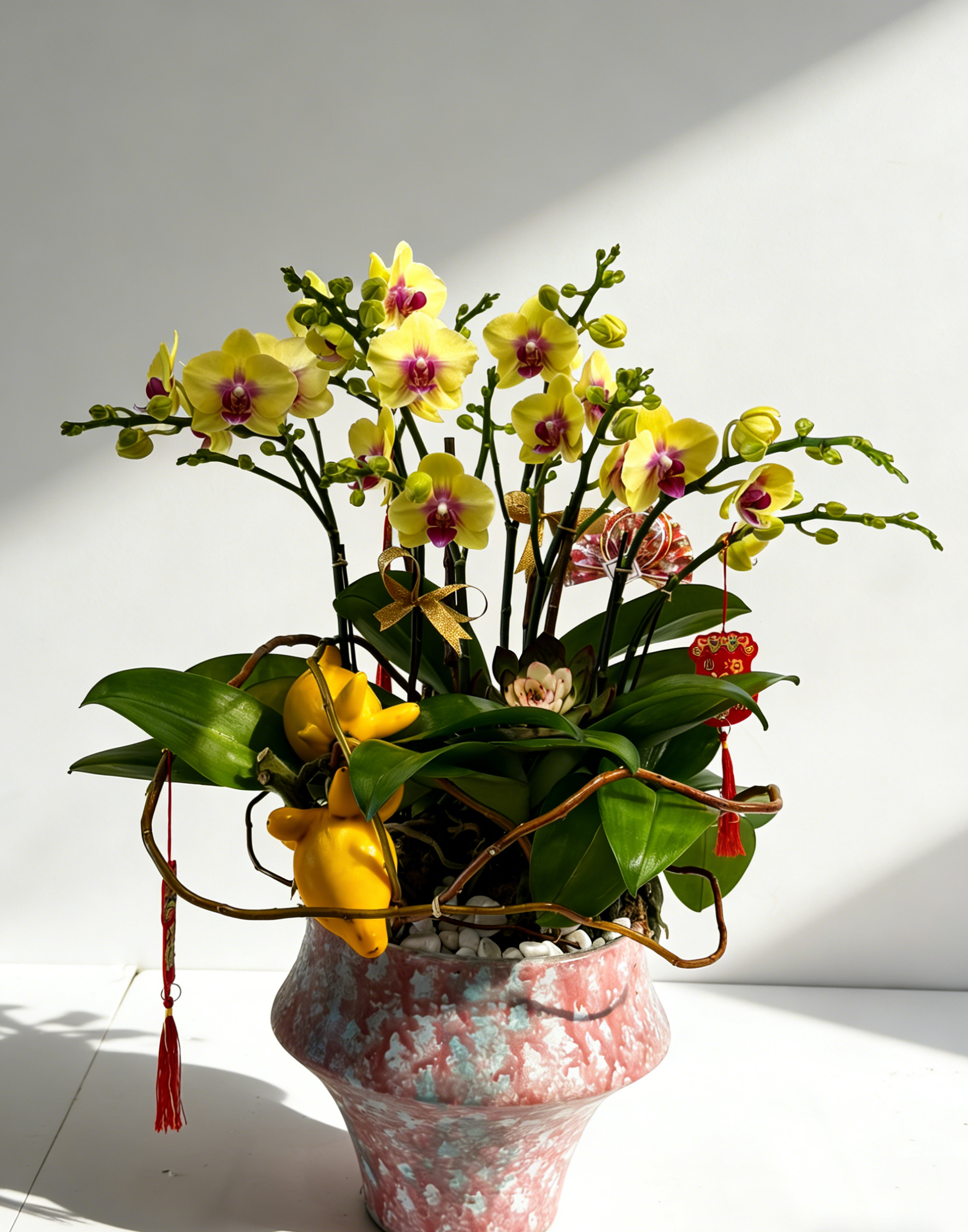 黃色及粉紅蝴蝶蘭為主、配綠葉的粉紅漸變裂紋瓷盆年節開運花藝