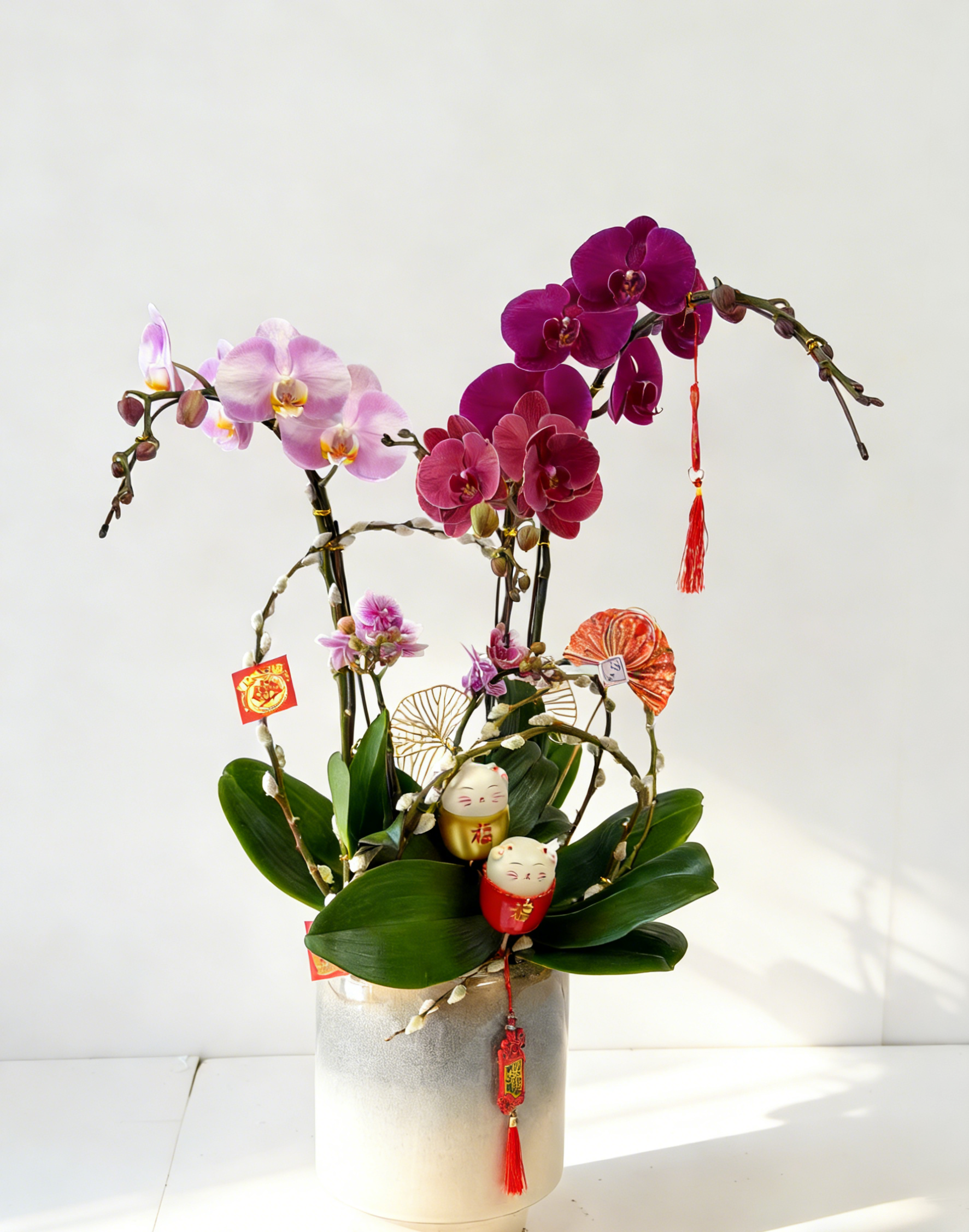 深紫色及粉紅蝴蝶蘭為主、配綠葉、招財貓、紅色扇子、多款紅色「福」吊飾的灰白漸變裂紋瓷盆年節開運花藝