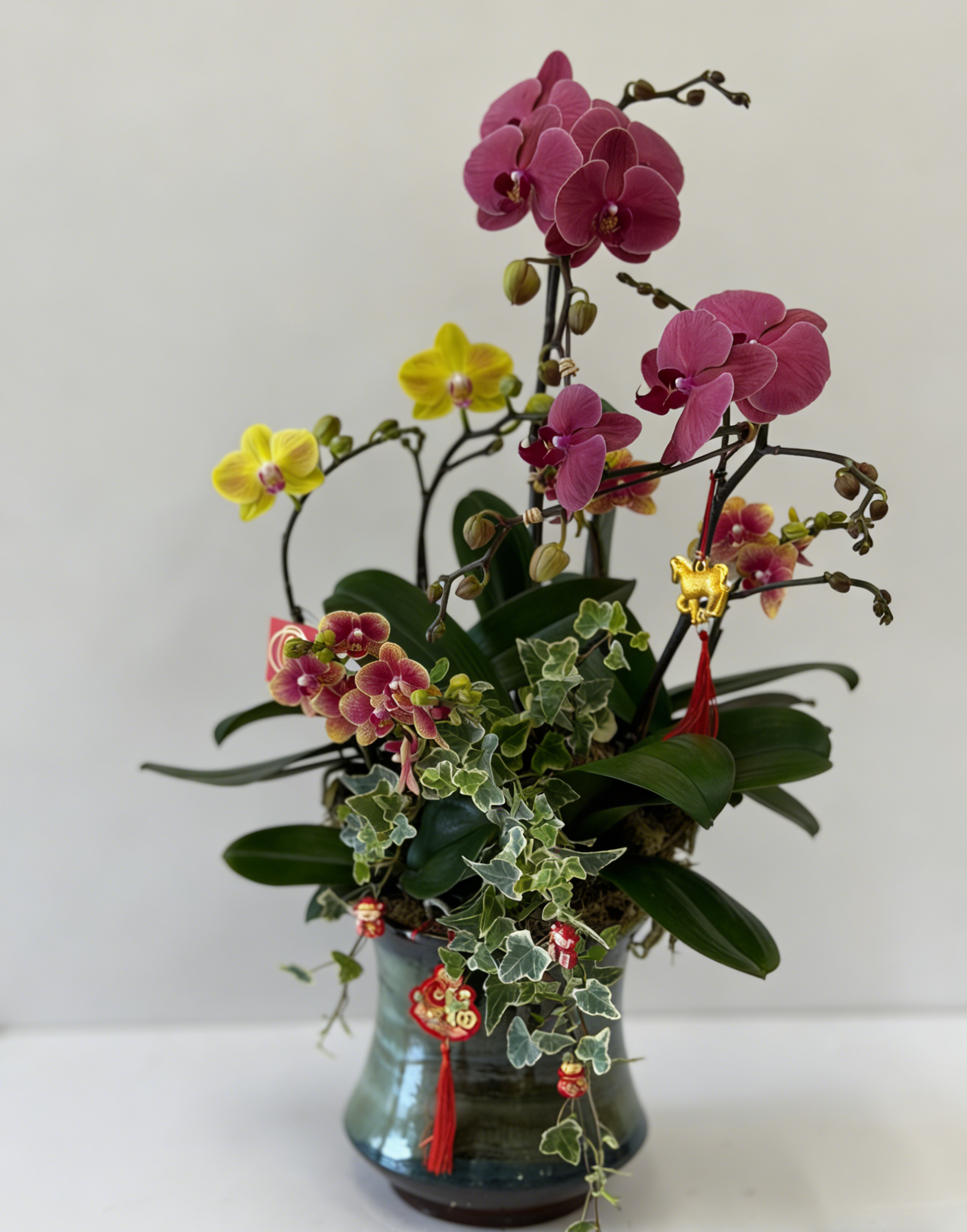 紫色及粉紅蝴蝶蘭為主、配綠葉、多款紅色「福」吊飾的藍綠漸變裂紋瓷盆年節開運花藝