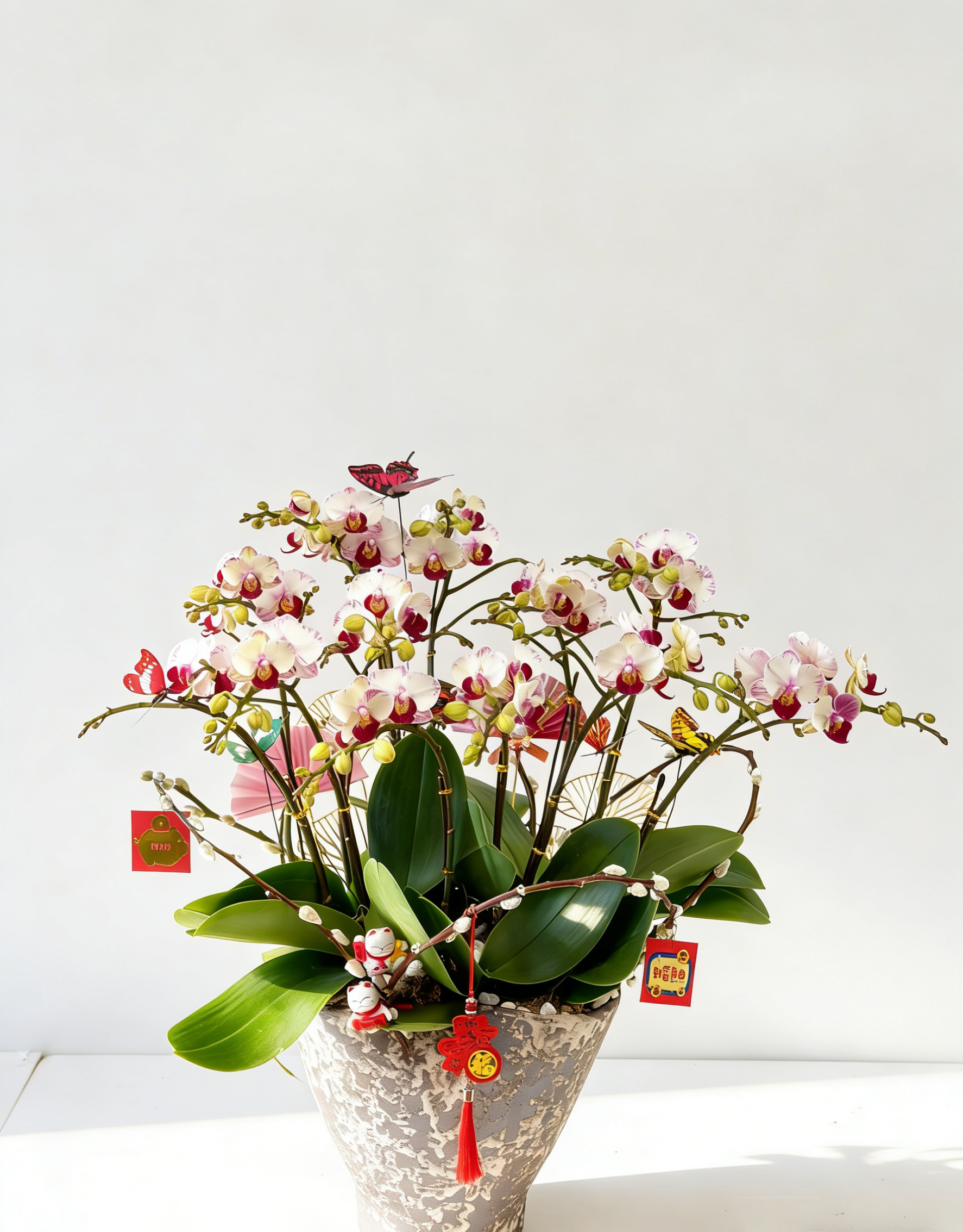 粉白帶紫邊蝴蝶蘭為主、配綠葉、招財貓、多款紅色「福」「招財進寶」的灰白裂紋瓷盆年節開運花藝